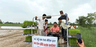 किसानलाई मेसिनद्वारा धान रोप्न सिकाइँदै