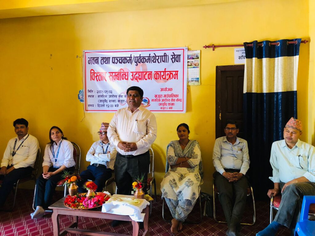 नागरिक आरोग्य सेवा केन्द्र खजुरा गाउँपालिका प्रमुख किरण खनाले जानकारी दिनुभयो । भवन तथा पञ्चकर्म/ पुर्वकर्म थेरापी सेवा विस्तारकाे उद्घाटन गर्दै खजुरा गाउँपालिका अध्यक्ष डम्बर बहादुर विक तुफानले आयुर्वेद उपचार पद्धति र योग शिक्षाप्रति मानिसको आकर्षण बढ्नु स्वास्थ्यका लागि राम्रो भएको र खजुरा नागरिक आराेग्य सेवा केन्द्रलाई अस्पतालकाे रुपमा बिकास गर्ने बताउनुभयो ।