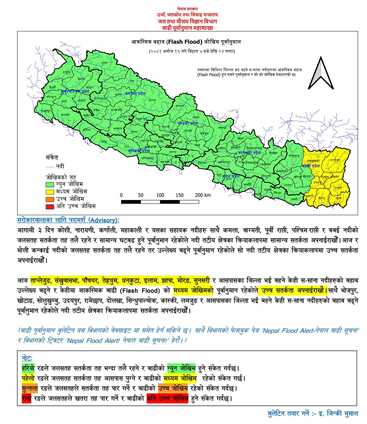महाशाखाका अनुसार ठूला नदीहरुमा बाढीको जोखिम नभए पनि साना नदी तथा खोलाहरुमा आकस्मिक बाढीको जोखिम छ ।