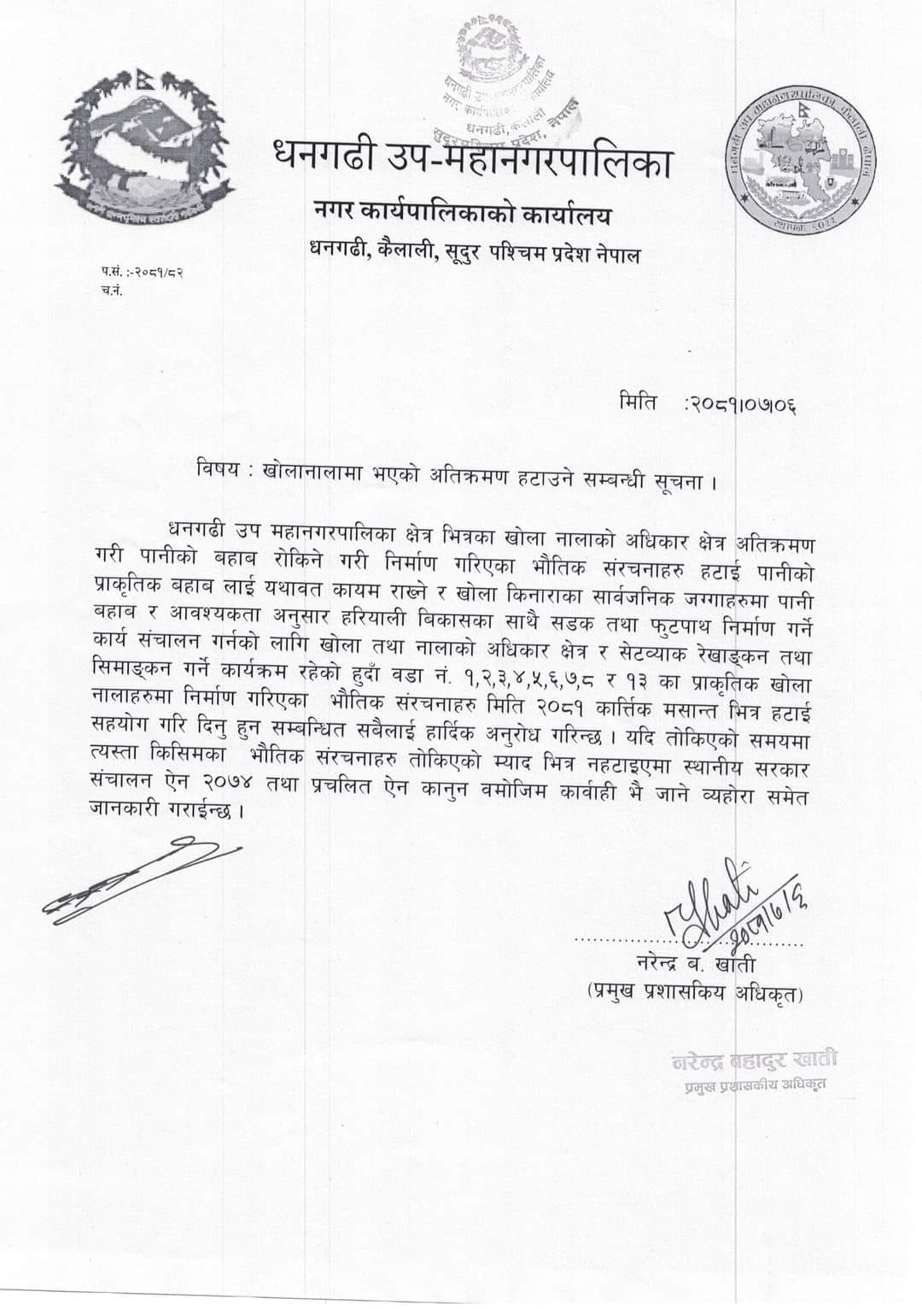 धनगढी उपमहानगरपालिकाले नगर क्षेत्रमा खोलानाला अतिक्रमण गरी बनाइएका संरचना हटाउन निर्देशन दिएको छ ।