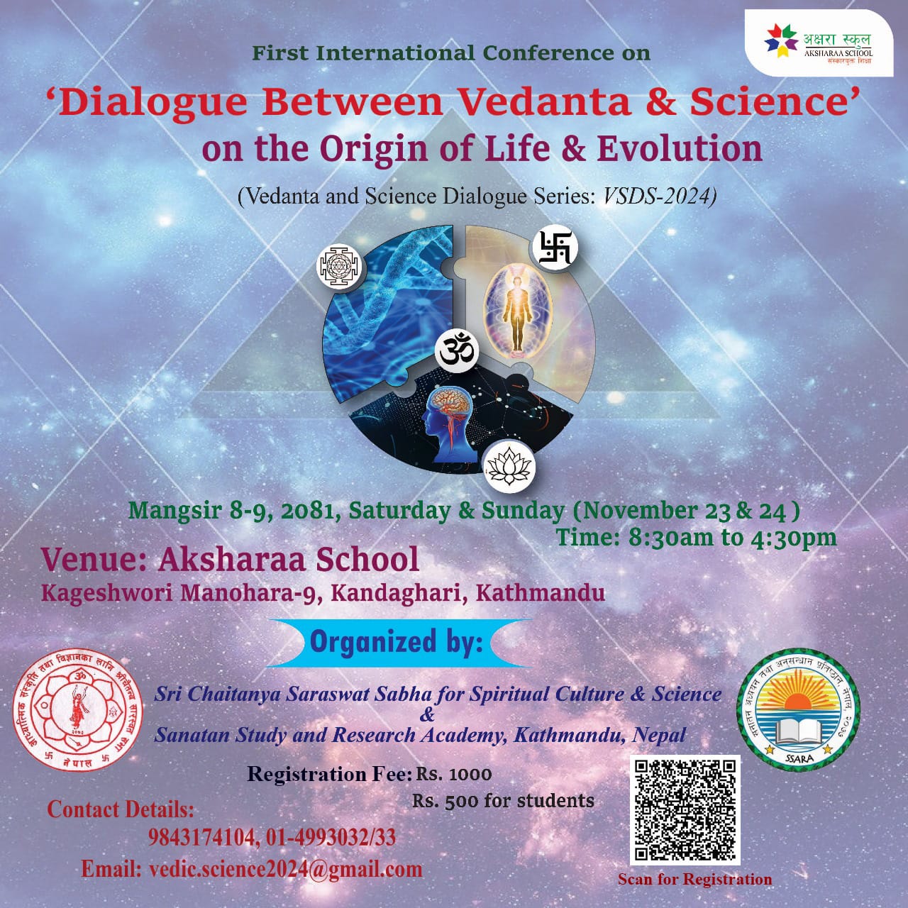 कागेश्वरी मनोहरा नगरपालिका(९, काँडाघारी स्थित अक्षरा स्कुलमा २०८१ मङ्सिर ८(९, मा हुने वेदान्त र विज्ञानबीचको जीवन र विकासको उत्पत्तिबारेको पहिलो अन्तर्रा्ष्ट्रिय सम्मेलन हुने भएको छ । श्री चैतन्य सारस्वत संस्थान, नृसिंहपल्ली, नवद्वीप धाम, ध्द्य, भारत, भक्तिवेदान्त संस्थान, प्रिन्सटन, प्रिन्सटन, ल्व्, ग्क्ब्, श्री चैतन्य सारस्वत सभा, काठमाडौं(नेपाल, सनातन अध्ययन प्रतिस्ठान नेपालको आयोजना र अक्षरा स्कूल, काठमाडौंको सहआयोजनामा उक्त सम्मेलन हुने भएको हो ।