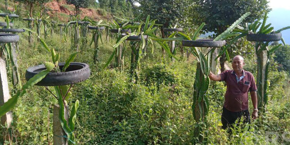 साँगाचोकगढी नगरपालिका–१४ डडुवाका किसान ओमबहादुर बस्नेत आफूले सुरु गरेको ‘ड्रागन फ्रुट’ खेतीबाट मनग्य आम्दानी भएपछि खेती विस्तारको योजना बनाउनुभएको छ ।