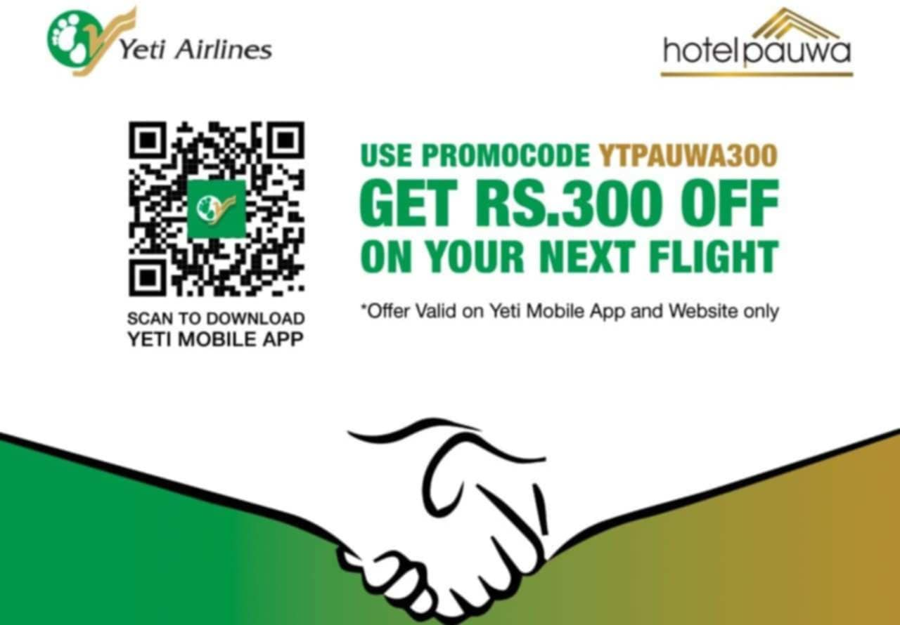 नेपालका बिभिन्न स्थानहरुमा नेपाली हस्पिटालिटीसहितको सेवा दिँदै आएको होटल पौवाको प्रोमो कोड प्रयोग गरेर यति एयरलाइन्सको विमानमा हवाई यात्रा गर्दा छुट पाइने भएको छ ।