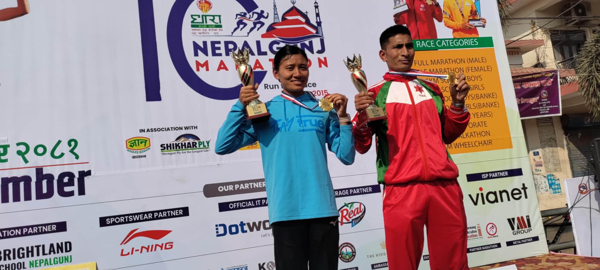 यसैगरी नेपालगन्ज महिला हाफ म्याराथनको उपाधी लगातार चौथोपटक सन्तोषी श्रेष्ठले जितेकी छन् भने पुष्पा भण्डारी दोस्रो र विमला कार्की तेस्रो भएका छन् । उनीहरुले क्रमशः नगद ७५ हजार, ५० हजार र २५ हजार पुरस्कार प्राप्त गरेका छन् । सन्तोषीले एक घण्टा १७ मिनेट ३० सेकेण्डमा कोर्स पूरा गरिन् । दोस्रो भएकी भण्डारीले निर्धारित दूरी एक घण्टा १९ मिनेट १२ सेकेन्डमा पूरा गरिन् । तेस्रो भएकी विमला कार्कीले एक घण्टा ४९ मिनेट १५ सेकेन्ड र चौथो भएकी स्वस्तिका शाहीले निर्धारित दूरी एक घण्टा ५२ मिनेट ३४ सेकेन्डमा पूरा गरेकी थिइन् ।