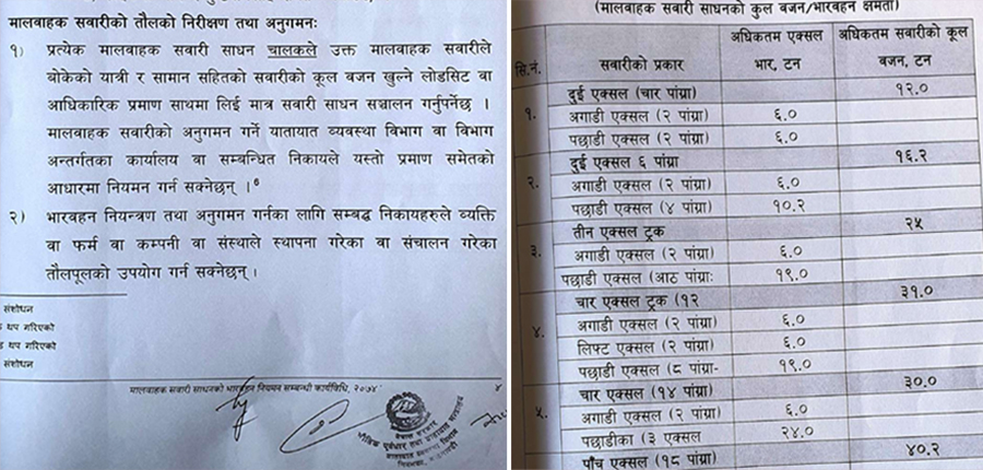 मालवाहक सवारी साधनको भारवहन सम्बन्धी निर्देशिका २०७४ (संशोधन सहित) अनुसार नेपालका सडकमा अधिकतम ४०.२ टन बोक्न पाइने नियम छ ।