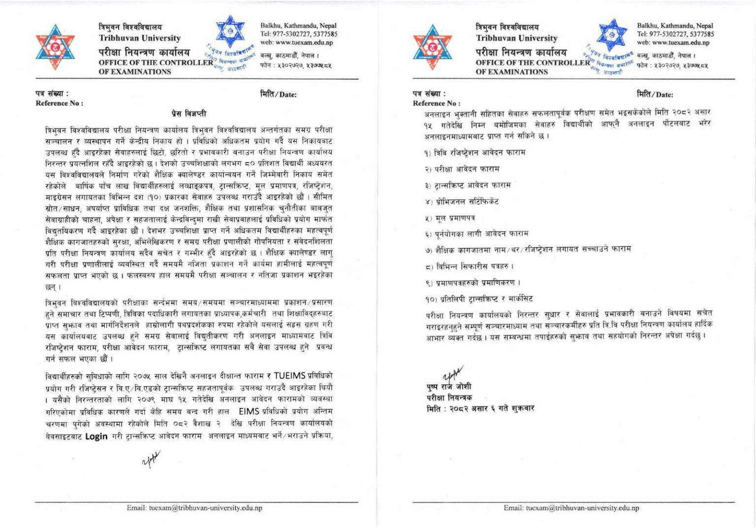 त्रिभुवन विश्वविद्यालय, परीक्षा नियन्त्रण कार्यालय बल्खुको १० वटा सेवा अब अनलाइनबाट हुने भएको छ ।
