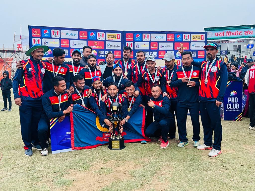 पर्सा क्रिकेट संघको आयोजनामा वीरगंजमा संचालित नेपाल प्रो क्लब च्याम्पियनसिप टि-२० क्रिकेट प्रतियोगिताको उपाधि नेपाल पुलिस क्लबले हासिल गरेको छ । वीरगंजस्थित नारायणी रंगशालामा शनिबार भएको फाइनल खेलमा पर्सा-११ लाई १ सय रनको फराकिलो अन्तरले पराजित गर्दै नेपाल पुलिस क्लबले उक्त उपाधिसँगै ५ लाख रूपैयाँ नगद पुरस्कार प्राप्त गरेको छ । टस जितेर पहिलो ब्याटिङ गरेको नेपाल पुलिस क्लबले निर्धारित २० ओभरमा आठ विकेटको क्षतिमा १ सय ४५ रन बनाएको थियो ।