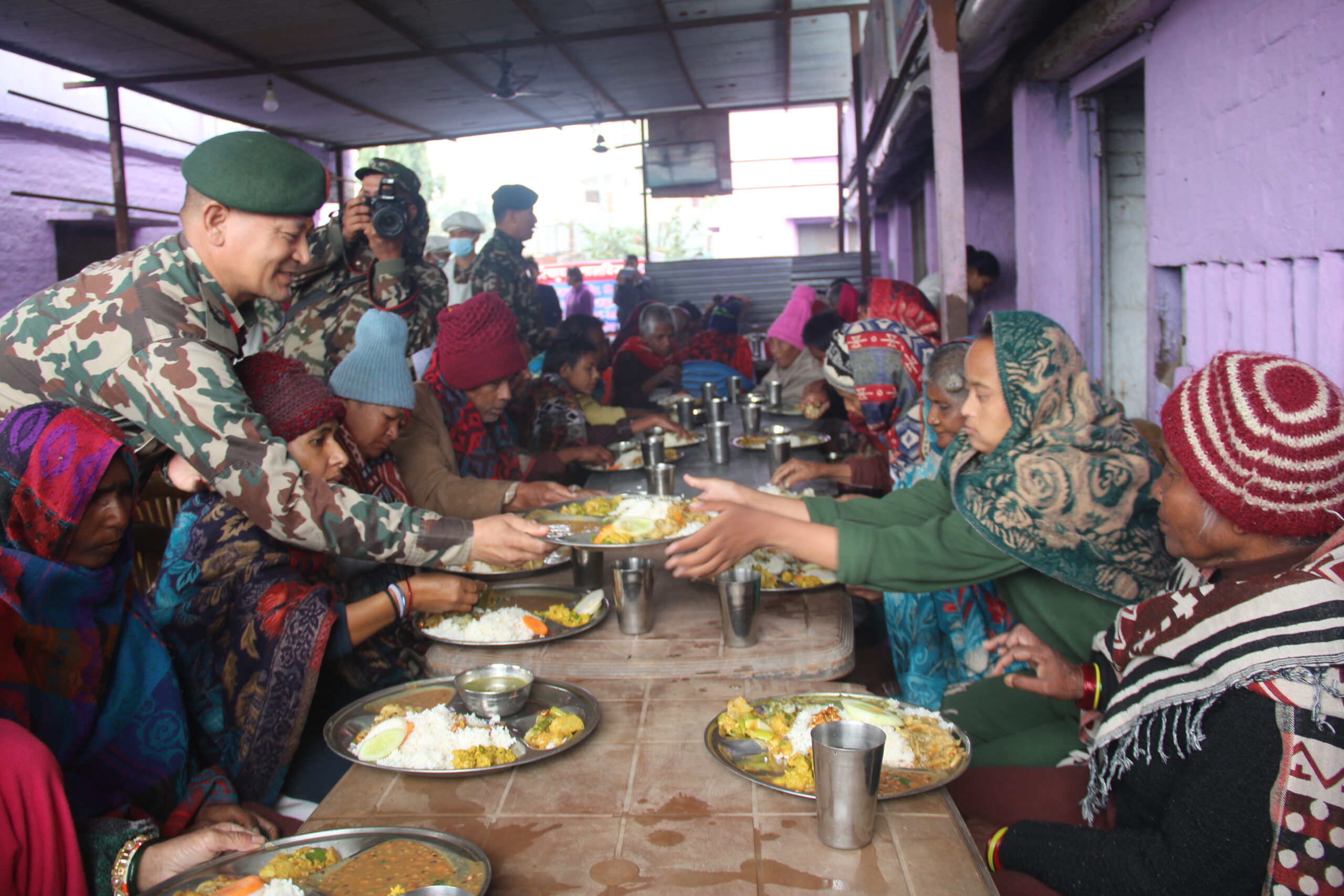 सहायक रथी थापाले सेनाले राष्ट्रको सेवासँगै सामाजिक सेवामा पनि योगदान पुर्याउँछ भन्ने उद्येश्यले एक दिने दिवा भोज कार्यक्रम गरिएको बताउनुभयो । उहाँले ‘जस्को कोही हुँदैन उस्को साथमा नेपाली सेना सधैं रहन्छ ।’ भन्दै आश्रममा रहनु भएका साहाराबिहीन जेष्ठ नागरिक र बालबालिकाहरुलाई एक्लो महसुस नगर्न आग्रह गर्नु भएको थियो । बाहीनीपति थापाले आफैले नै जेष्ठ नागरिक र बालबालिकाहरुलाई भोजन खुवाउनुका साथै लत्ताकपडा वितरण गर्नु भएको थियो ।