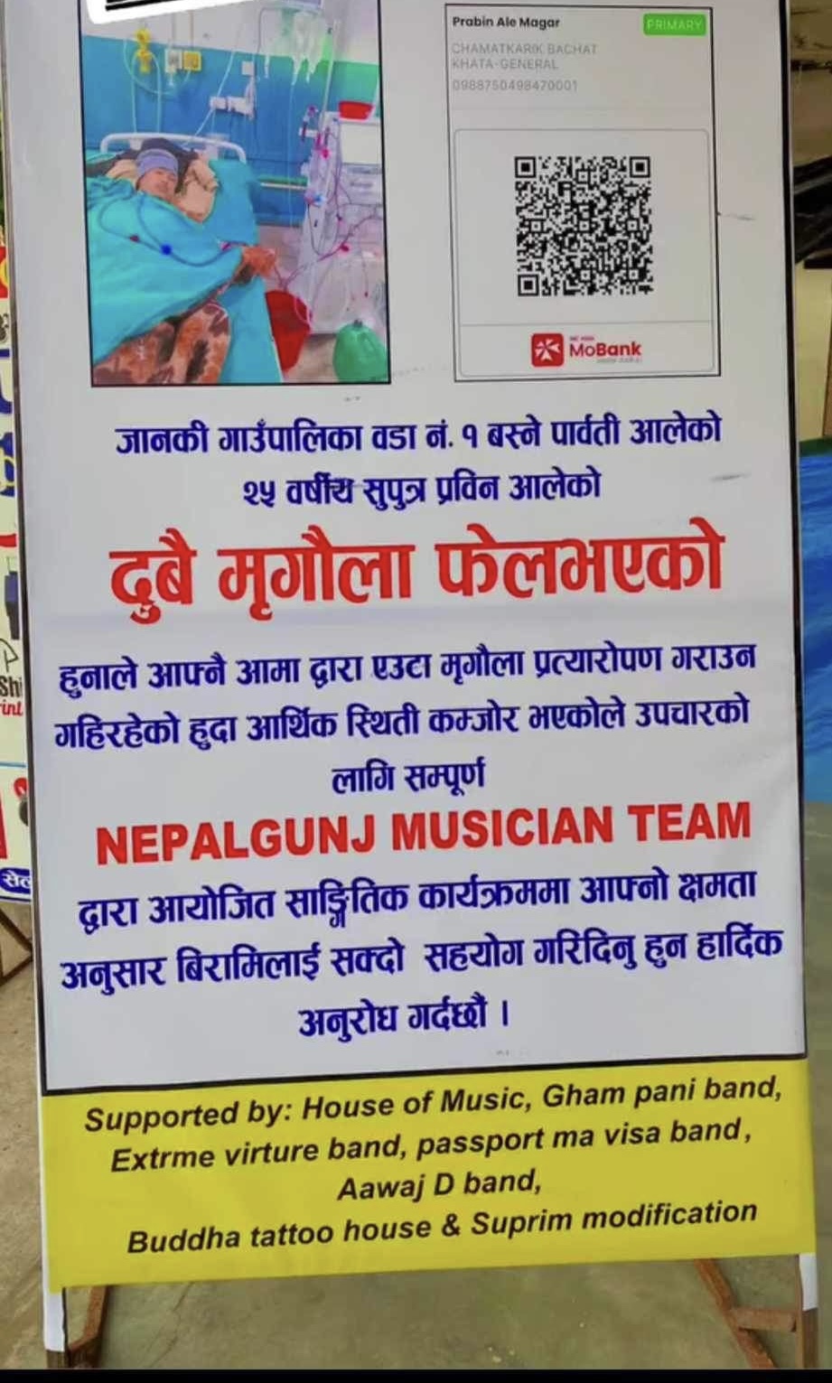 जानकी गाउँपालिका वडा नं. १ बस्ने पार्वती आलेको २५ वर्षीय सुपुत्र प्रविन आलेको दुबै मृगौला फेलभएकोहुनाले आफ्नै आमा द्वारा एउटा मृगौला प्रत्यारोपण गराउन गहिरहेको हुदा आर्थिक स्थिती कम्जोर भएकोले उपचारको लागि सम्पूर्ण NEPALGUNJ MUSICIAN TEAM द्वारा आयोजित साङ्गितिक कार्यक्रममा आफ्नो क्षमता अनुसार बिरामिलाई सक्दो सहयोग गरिदिनु हुन हार्दिक अनुरोध गर्दै धम्बोझी स्थित अनुरोध कार्यक्रम