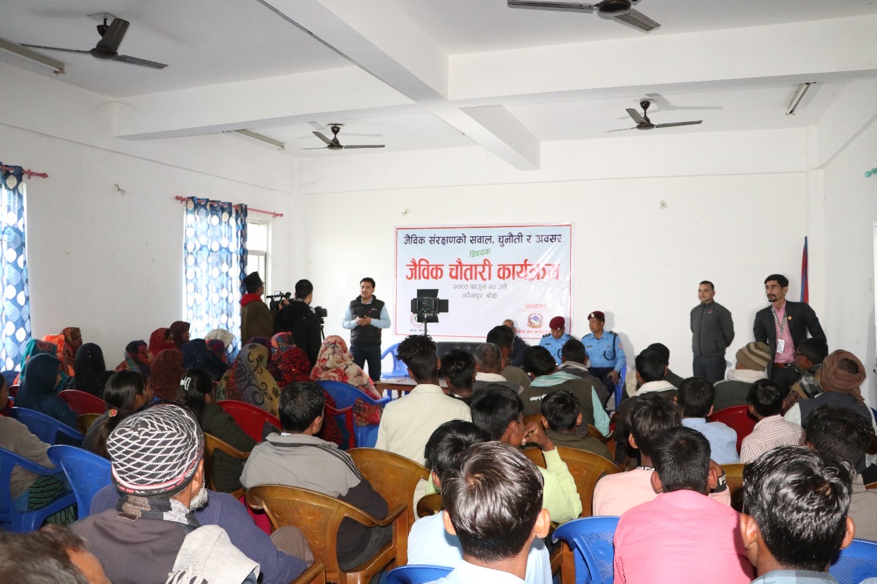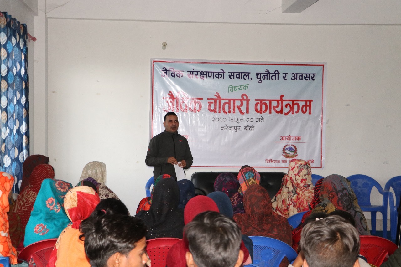 जैविक चौतारी कार्यक्रम मार्फत जैविक विविधताको संरक्षण गर्न सरोकारवालले जोड दिएका छन् । डिभिजन वन कार्यालय बाँके र बास नेपालको सयुंक्त आयोजनामा फाुगन २० गते नरैनापुर गाउँपालिकाको वडा नं. १, २ र ३ का स्थानीय नागरिक, सामुदायिक वन उपभोक्ता समितिका पदाधिकारीहरु, सुरक्षाकर्मी, सामुदायिक वन उपभोक्ता महासंघ, स्थानीय जनप्रतिनिधिहरु सहित २०० जनाको सहभागिता रहेको जैविक चौतारी कार्यक्रमा पाँच बुद्धे प्रतिबद्धता जाहेर गर्दै सरोकारवालाहरुले स्थानीय नागरिकहरु नै वन संरक्षणमा जुट्नु पर्नेमा जोड दिइएका छन् ।