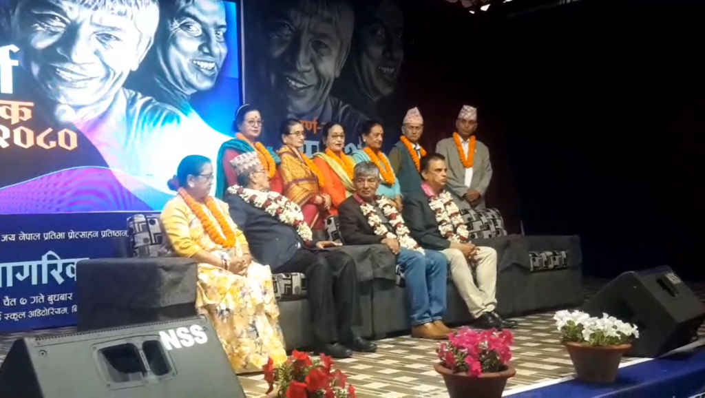 जय नेपाल प्रतिभा प्रोत्साहन प्रतिष्ठान झापाले ‘पूर्णटुङ्ग आर्दश नागरिक सम्मान २०८०’ द्वारा महजोडी मदनकृष्ण श्रेष्ठ र हरिवंश आचार्यलाई सम्मान गरेको छ । विर्तामोडमा आज आयोजित कार्यक्रममा प्रतिष्ठानले उहाँहरुलाई नगद रु एक लाख ११ हजार एक सय ११ सहित सम्मान गरेको हो । उहाँहरुलाई भारतीय नाट्यकर्मी सिके श्रेष्ठले सम्मान गर्नुभएको थियो ।